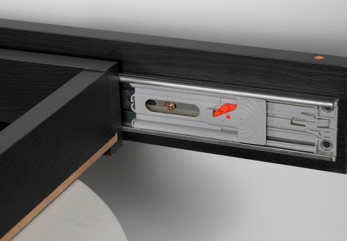 A Gaveta Slim Modular está disponível nas seguintes cores: preto, branco, branco e rosa, e preto e laranja.
